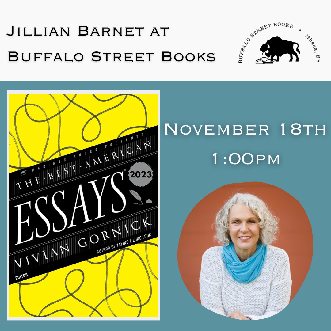 The Best American Essays is a yearly anthology of the very best essays published in the United States during the prior year. The guest editor for 2023, Vivian Gorick, renowned essayist and celebrated feminist writer, has chosen twenty essays out of thousands that represent the best examples of the form. Among them is an essay by local author, Jillian Barnet. The Best American Essays anthology will be released in November. Jillian will read from her essay, “Any Kind of Leaving,” at Buffalo Street Books on November 18 at 1:00 p.m. This essay was one of the first selected by Gornick to appear in the anthology. Robert Atwan, editor of the Best American series wrote, “I loved reading it.”