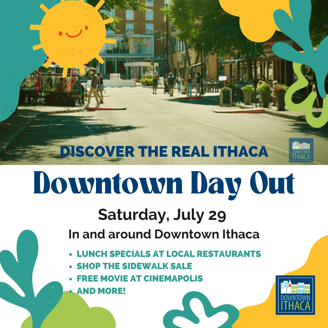 Locals and visitors, you are invited to come and have a fun day out exploring corners of Downtown Ithaca you might not have seen before. Shop the sidewalk sale, enjoy an outdoor lunch, and then catch a free matinee at Cinemapolis. Bring a friend, bring a picnic blanket, and discover the real Downtown Ithaca!