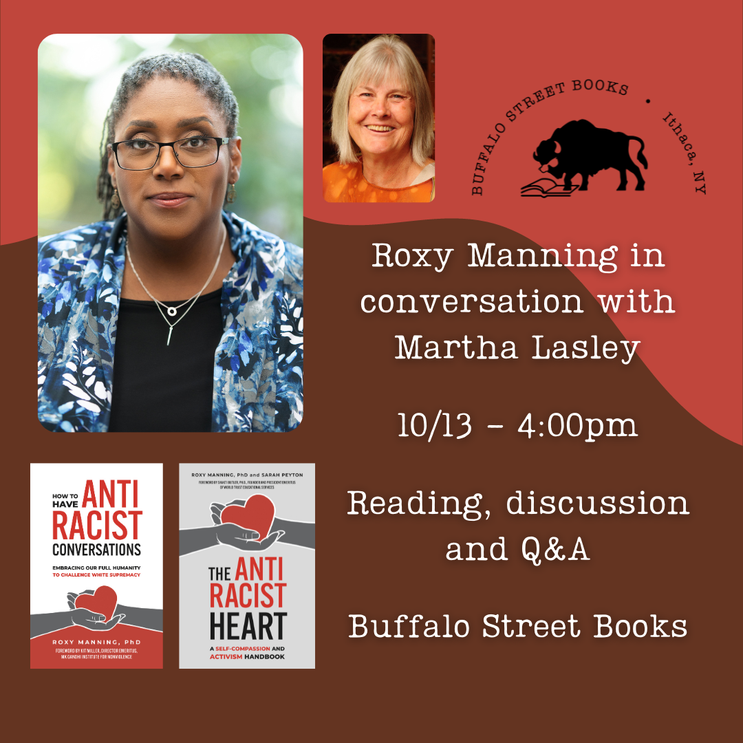 Roxy Manning will be at Buffalo Street Books with Martha Lasley to discuss and read from her book, How to Have Antiracist Conversations: Embracing Our Full Humanity to Challenge White Supremacy and it’s companion text, The Antiracist Heart: A Self-Compassion and Activism Handbook.