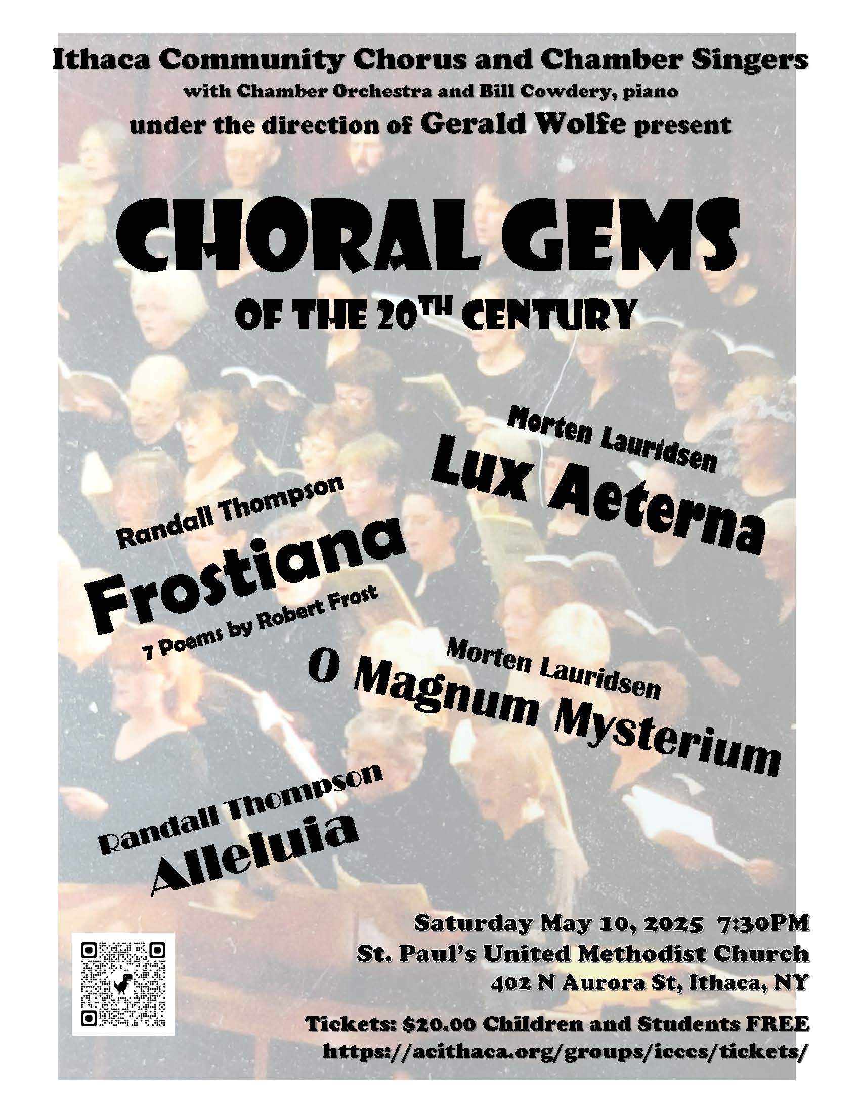 The Ithaca Community Chorus & Chamber Singers will present beloved pieces by two eminent twentieth-century composers at 7:30 p.m. on Saturday, May 10, at St. Paul’s United Methodist Church, 402 North Aurora Street, Ithaca: Randall Thompson’s “Frostiana” and “Alleluia,” and “Lux Aeterna” and “O Magnum Mysterium” by Morten Lauridsen. Tickets are $20 (students & children free) and are available in advance online at https://acithaca.org/groups/icccs/tickets/ and at the door.