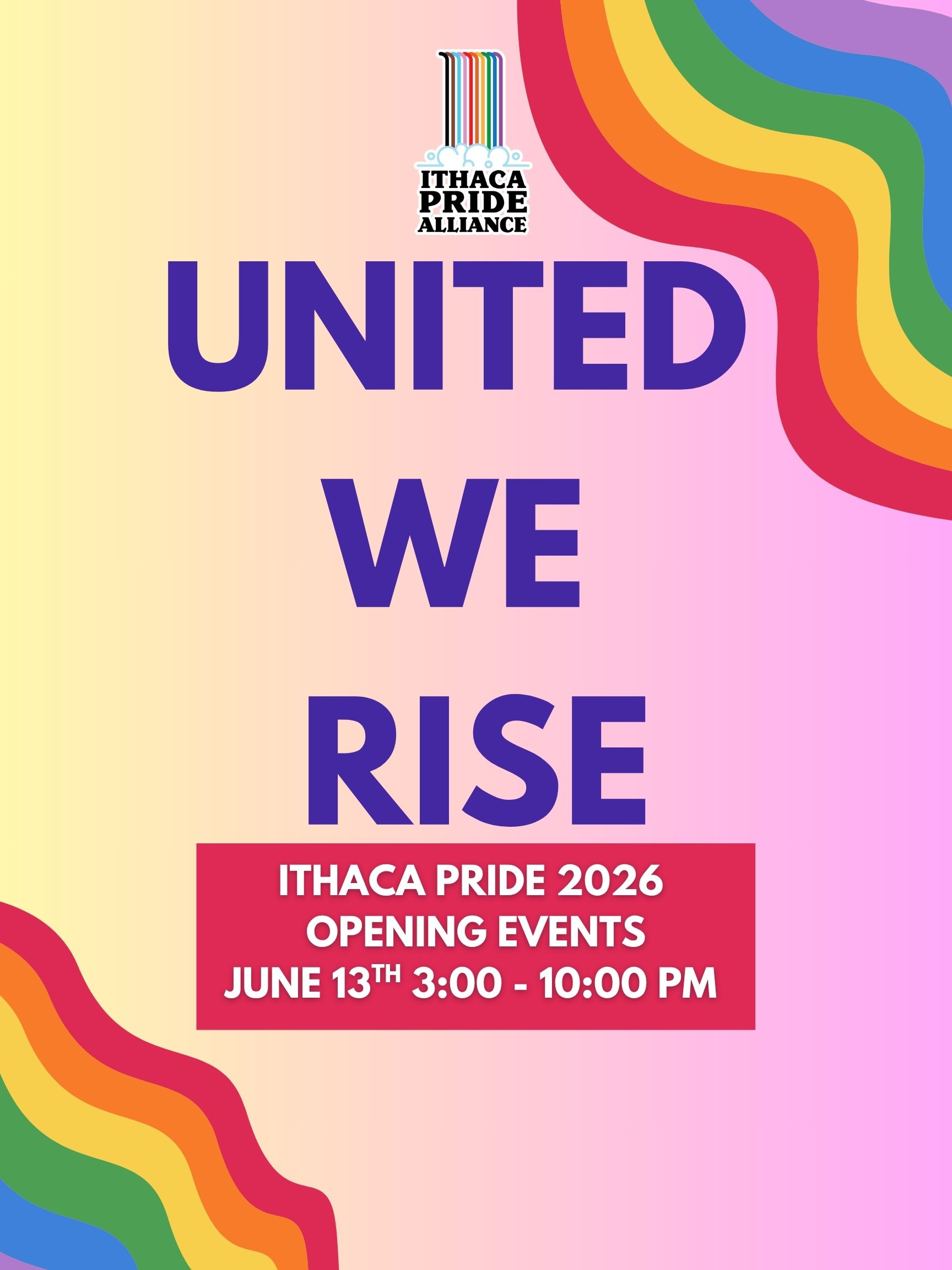 Join the Ithaca Pride Alliance on the Commons as we kick off Pride Weekend with our Opening Events on Friday, June 13th from 3-10pm! Live music from 3-6pm, Opening Ceremonies from 6-7pm then dance the night away at our All-Ages Pride Dance Party from 7-10pm at the Bernie Milton Pavilion. Local resources and organizations will be tabling throughout the event. Stop by our Affirmation Station to get all decked out in Pride Gear, grab your Pride Tees from the Sunny Days booth, and get information about all of the Ithaca Pride Events happening all weekend long at the IPA booth! Accessibility FAQs and up-to-date information available at https://www.ithacapridealliance.org/ithaca-pride
