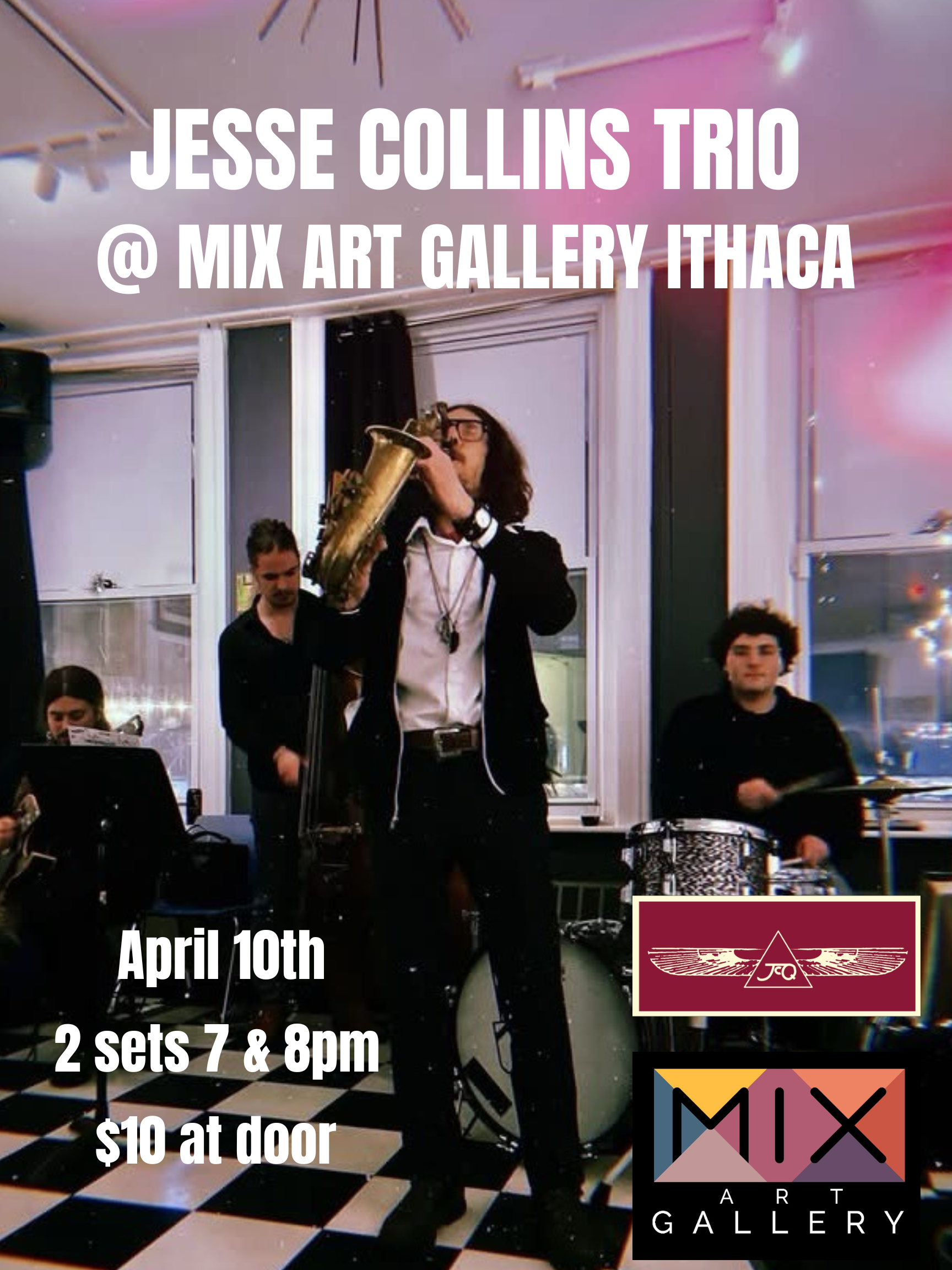 Experience a special evening of live jazz with the Jesse Collins Trio at MIX Art Gallery. Blending improvisation, soulful rhythms, and contemporary jazz influences, this dynamic ensemble transforms the gallery into an intimate, vibrant listening space. Join us for an unforgettable night where art, music, and community come together in downtown Ithaca right on the Commons.