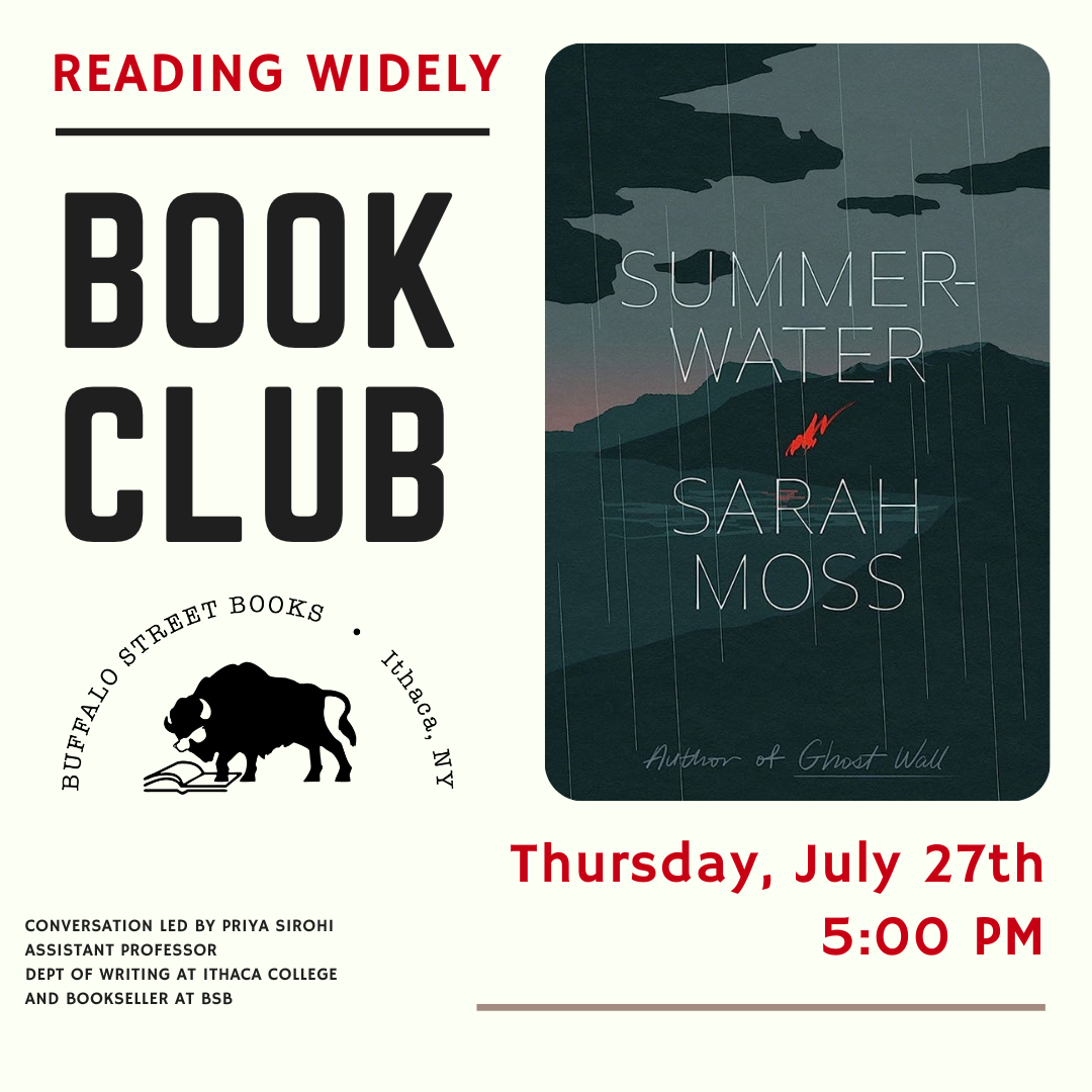 Join us for a small group discussion of Sarah Moss’s Summer-Water on Thursday, July 27th at 5:00 p.m. Conversation will be led by Priya Sirohi, assistant professor at Ithaca College and bookseller here at BSB! Book club titles are 10% off in the store and online.