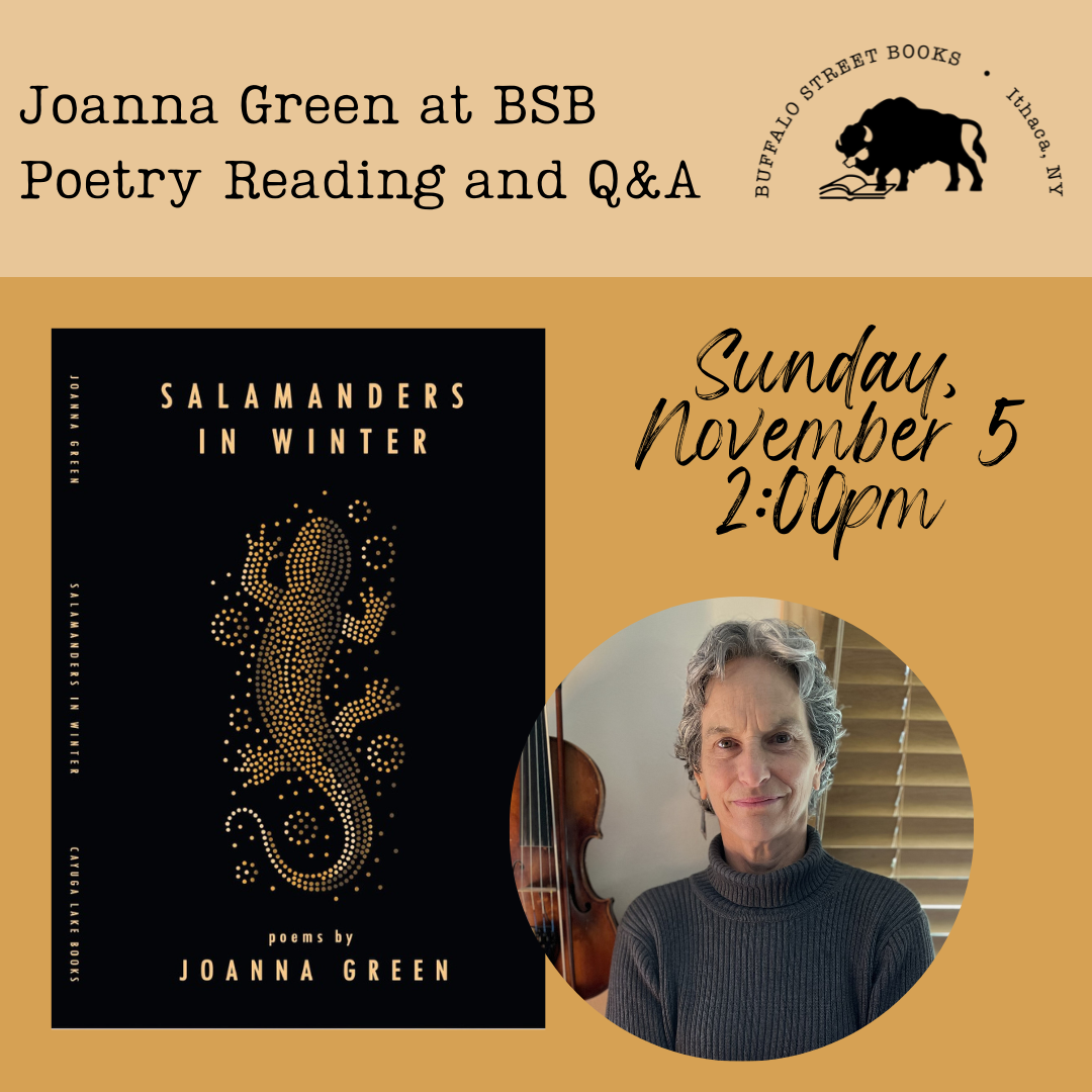 Join Joanna Green at Buffalo Street Books for the launch of her debut collection of poems, “Salamanders in Winter”, just published by Cayuga Lake Books. Her work explores the conundrum of living life fully in the midst of societal collapse. Before turning to writing and music upon retirement, Green was a pioneer in the field of sustainable agriculture at Cornell University, fighting against the continuing industrialization of farming and the impoverishment of rural communities. In 2010 she founded the non-profit Groundswell Center for Local Food and Farming, one of the nation’s first farmer training programs to confront the deep racial inequities embedded in our agriculture and food systems. She now sings and plays vibes and violin in two local jazz bands, and writes regularly as a member of the Cascadilla Writers Group.