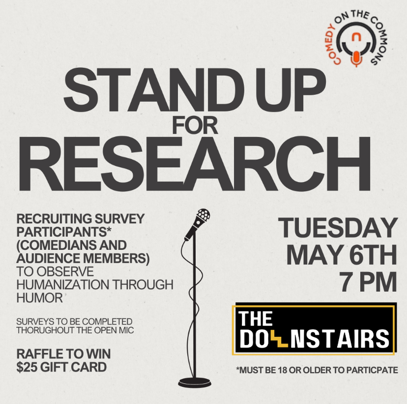 Calling all comedians and comedy lovers! In collaboration with the Downstairs and Comedy on the Commons, come on down to a comedy open mic for some laughs AND to participate in research! Fill out surveys throughout the open mic for a chance to win a $25 gift card to the Watershed/the Downstairs. Sign ups start at 6:30 pm, open mic starts at 7 pm. Must be 18 years or older to fill out surveys.