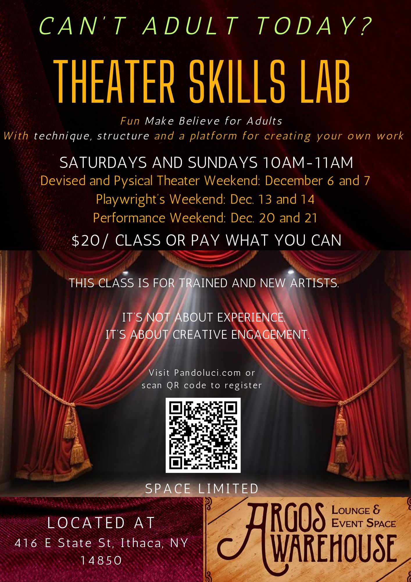 Theater Workshops for anyone who wants to explore the art of theater making! Skills lab is an hour-long workshop on Saturdays and Sundays in the month of December at The Argos Warehouse. Students can drop in for $20 a class, Pay what you can, or register for all six classes. Weekend One Dec. 6 & 7: Devised and Physical Theater Workshop, Weekend Two Dec. 13 & 14: Playwright’s Workshop, Weekend Three Dec. 20 and 21st: Performance Workshop. Whether you are a trained theater artist or new to the artform this workshop is for everyone. It is not about experience level, it is about creative engagement and collaboration. Have fun and create your own work in community! To register visit Pandoluci.com