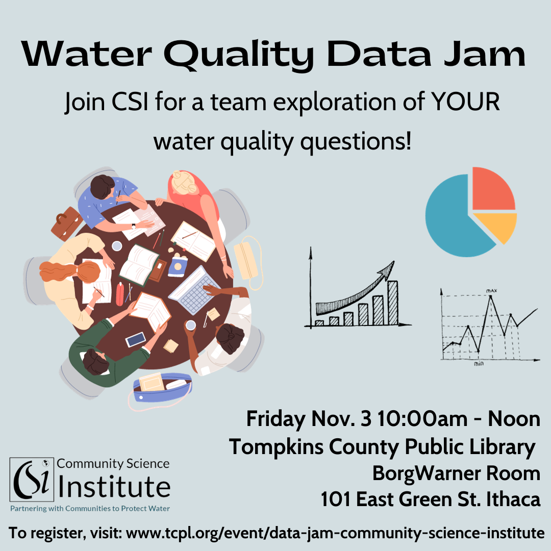 Community Science Institute (CSI) has been collecting water quality data in the Cayuga Lake Watershed for many years through our volunteer stream and lake monitoring partnerships. We invite you to come explore these data with us at our upcoming Water Quality Data Jam event hosted at Tompkins County Public Library. This event will give community members with questions such as those above an opportunity to delve into the data to find answers for themselves. CSI staff will be close at hand to guide teams to find critical information using our water quality database.