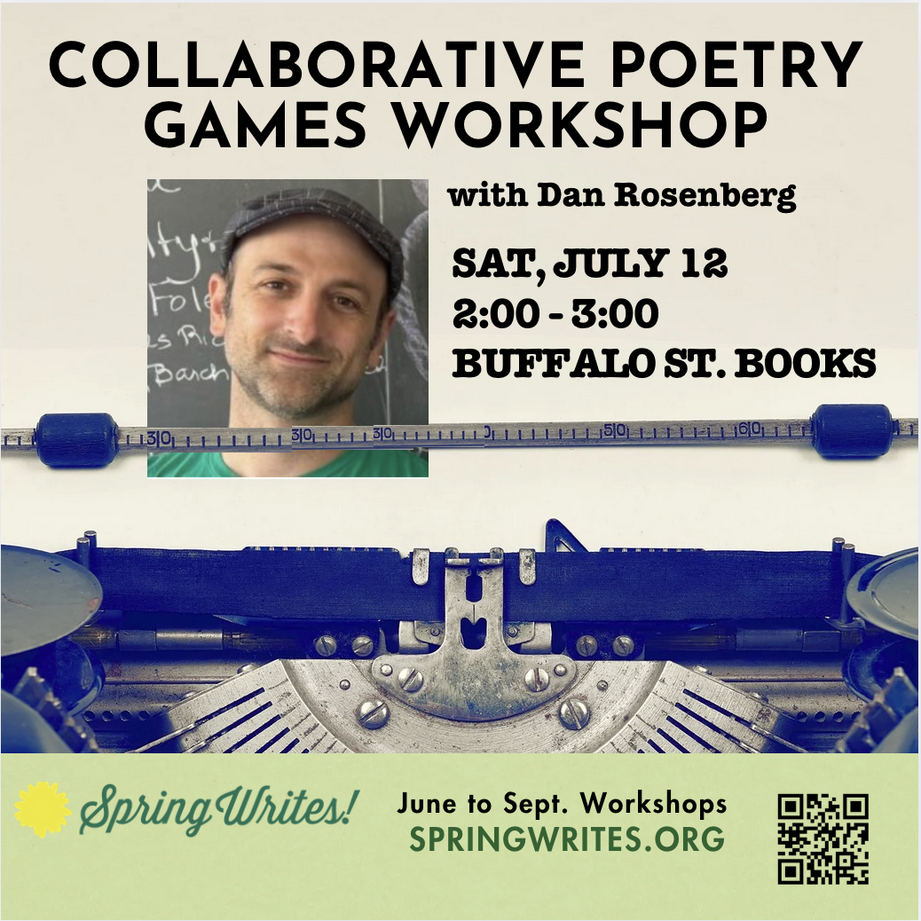 With Dan Rosenberg. Writing poetry isn’t always about finding the perfect word; sometimes it’s about having fun together and making each other laugh. For this workshop, we will try out some collaborative poetry games, creating strange and surprising poems in pairs and as a whole group. Everyone is welcome, from established poets looking to lean into their sense of play to teens looking for more creative ways to entertain themselves during a boring Chemistry lecture. The only requirement is that you don’t take yourself too seriously. Who will be selfless enough to just contribute a “the” to our poem? Who will turn our sweet poem raunchy? It might be you, if you join us!