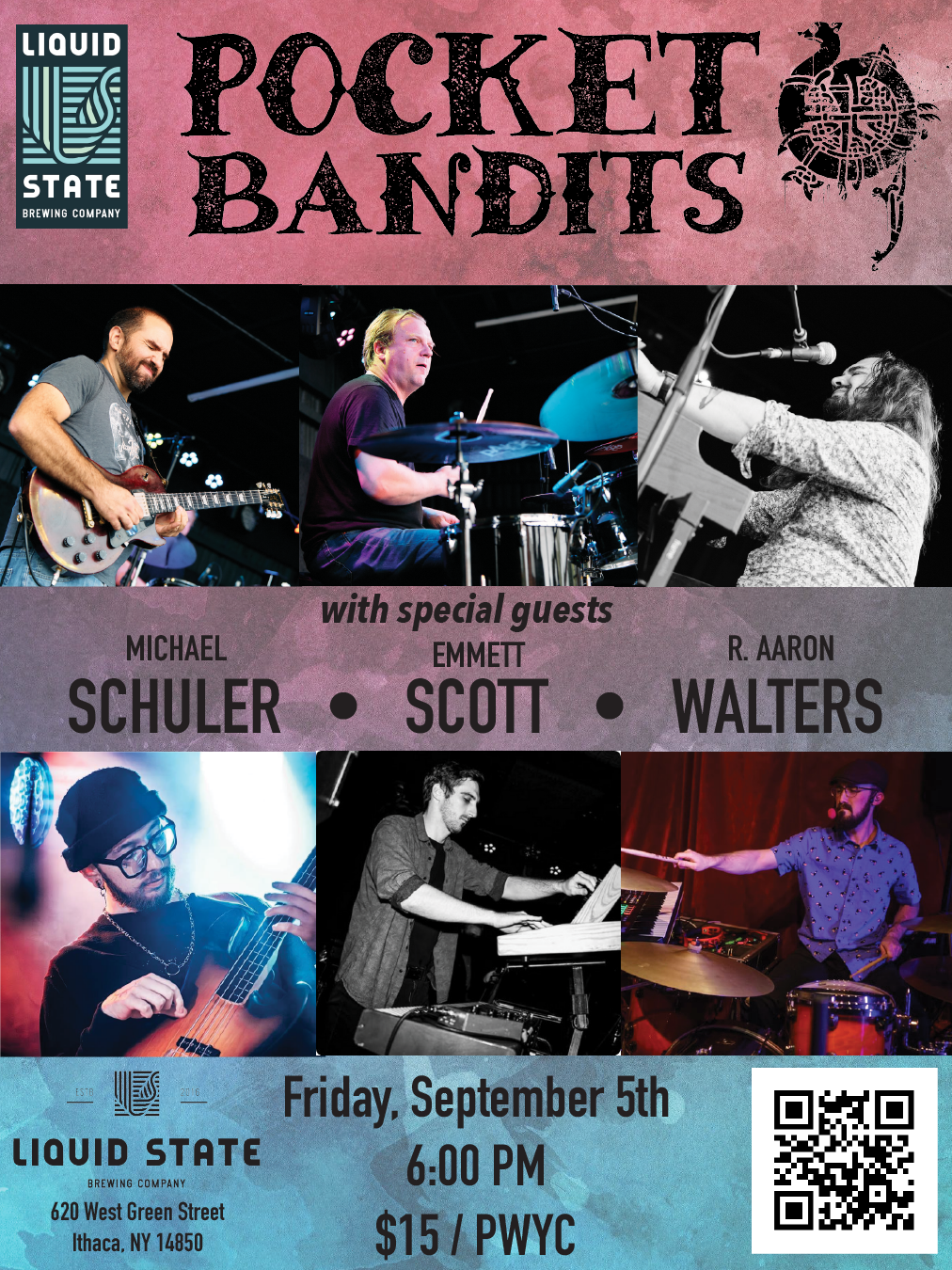 Experience Ithaca's favorite emerging progressive funk-fusion trio, Pocket Bandits! Hear Joe, Simon, and Sam lead an evening of original material and surprise covers in the barrel room at Liquid State Brewing Co in Downtown Ithaca. They'll be joined throughout the night by a host of special guest musicians including Micheal Schuler, Emmett Scott, R.Aaron Walters and many more! Check out ... Read More
