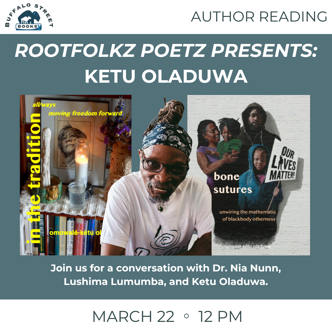 The OctoGenarian Tour: Celebrating Poetry that Liberates Community-Building Dialogue. Join us for a conversation with Dr. Nia Nunn, Lushima Lumumba, and Ketu Oladuwa. From Ketu Oladuwa: "Join the celebration of 80 cycles around the sun by getting back to our human rootz with poetry, music, and engagement with artists and their communities. Poetry is more than words on a page; ... Read More