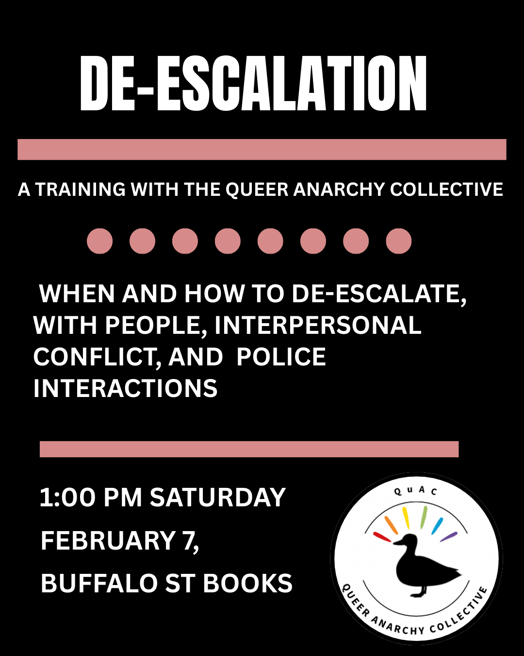 Join QuAC (Queer Anarchy Collective) for a de-escalation training session. When and how to de-escalate with people, interpersonal conflict, and police interactions!