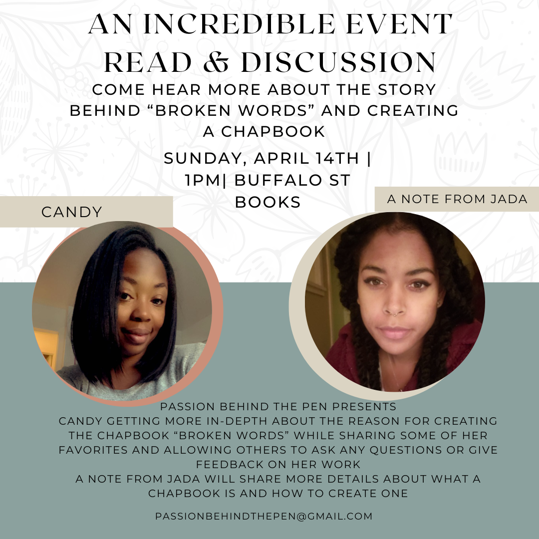 Keyturah Moore will hold a reading and discussion from her chapbook "Broken Words" at Buffalo Street Books. This will be a time to sit down and discuss with the author the story behind "Broken words" and how she used her journey of dealing with depression to find a creative outlet to cope.
