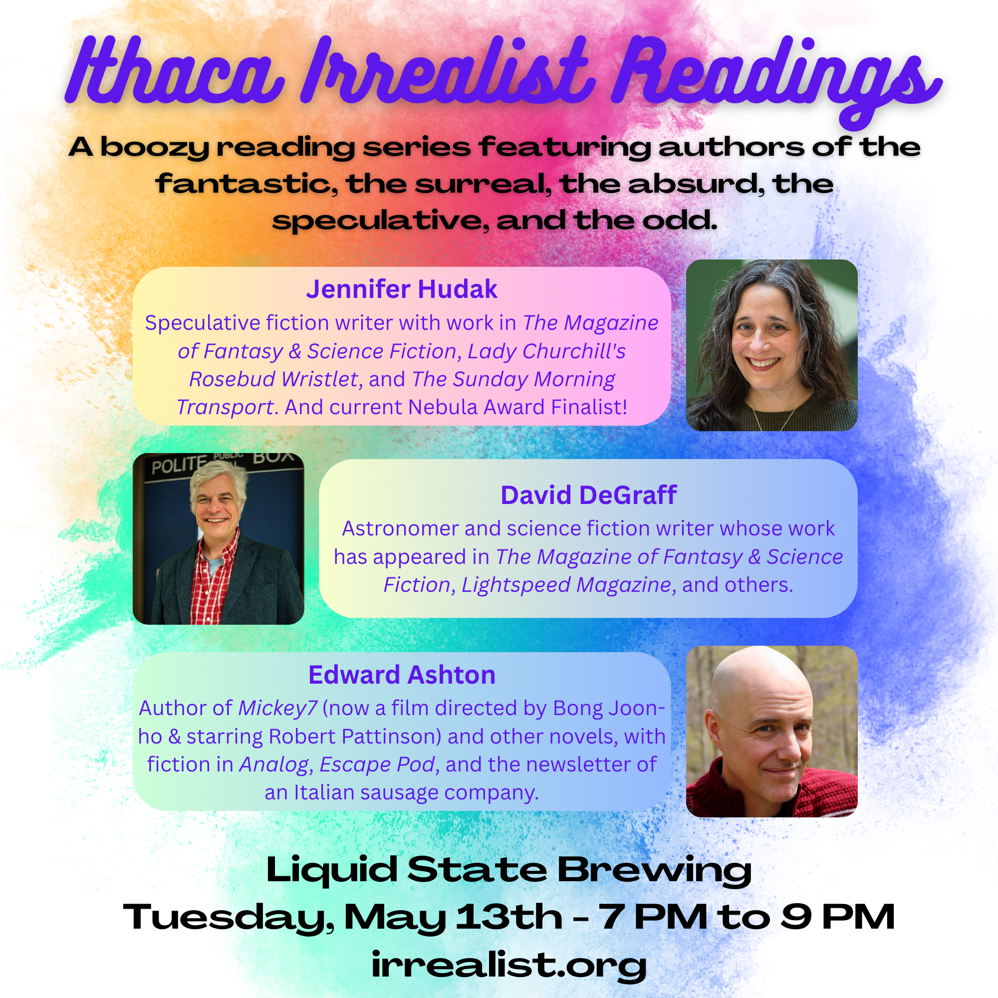 A boozy reading series featuring authors of the fantastic, the surreal, the absurd, the speculative, and the odd. This months featured authors are Jennifer Hudak, David DeGraff, and Edward Ashton