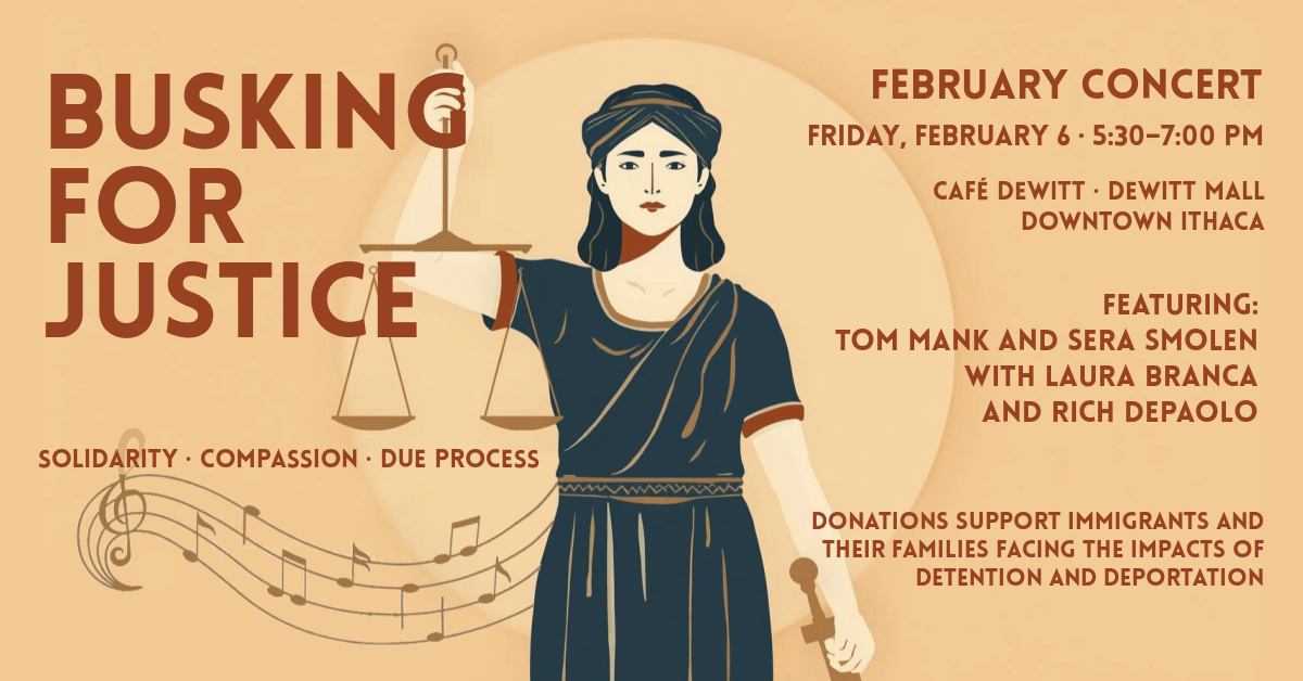 We're pleased to share news of Busking for Justice, a special fundraising series featuring local musicians, that will take place at Café Dewitt in downtown Ithaca's Dewitt Mall on first Fridays September through December. 100% of donations fund legal aid and bail for immigrants impacted by the threat of deportation. Café Dewitt will offer sandwiches and food for purchase. The second ... Read More