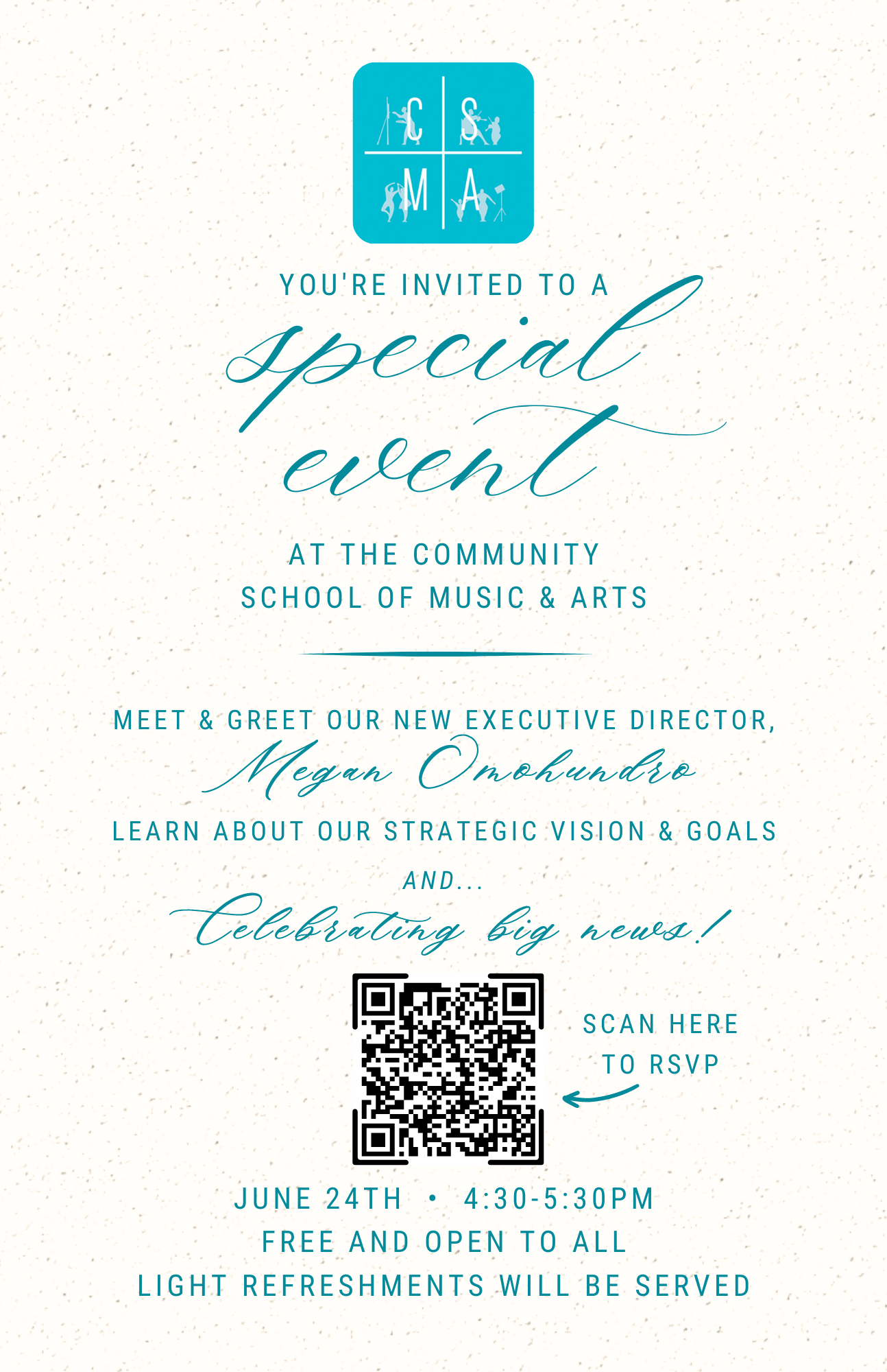 Join us at the Community School of Music & Arts for a free special event! - Meet and Greet our new Executive Director, Megan Omohundro - Enjoy light refreshments in our gallery and enjoy Kumi Korf's exhibit, "Tagasode" - Learn about our strategic vision & goals Plus... - We have a BIG announcement to make!